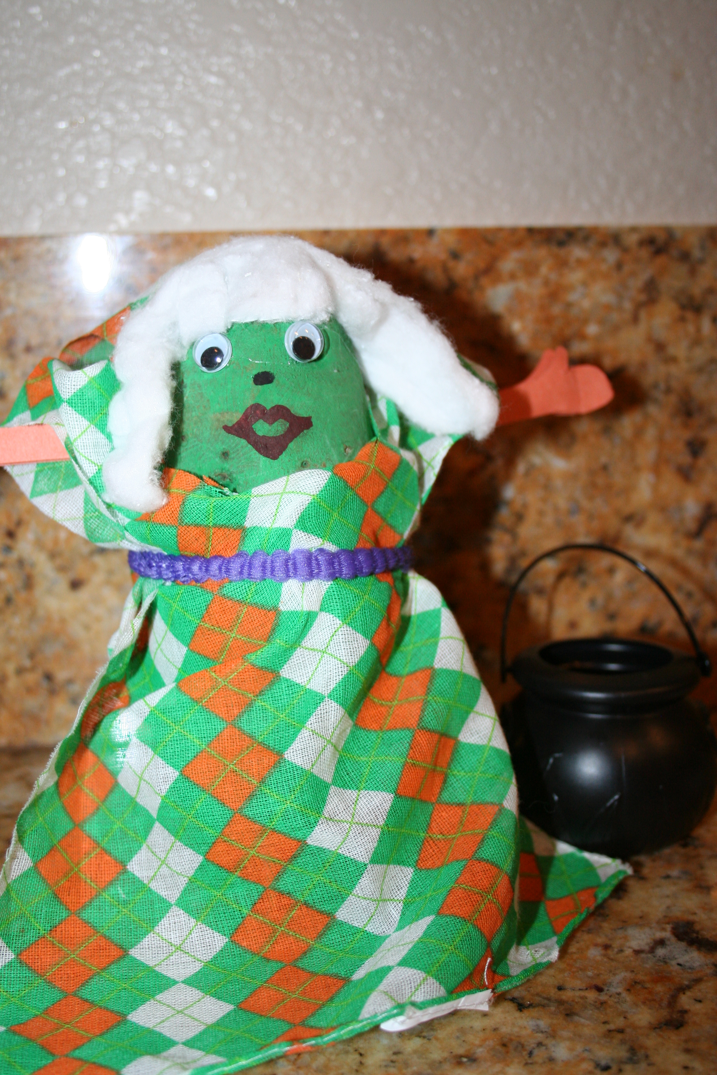 And what about my daughter’s potato? Well… she’s three and had many “design-changes” mid-project. I tried my best not to take over and make her a cute potato lass. True to her artistic direction, we ended up with “Potato Ghost Goldilocks Leprechaun”: